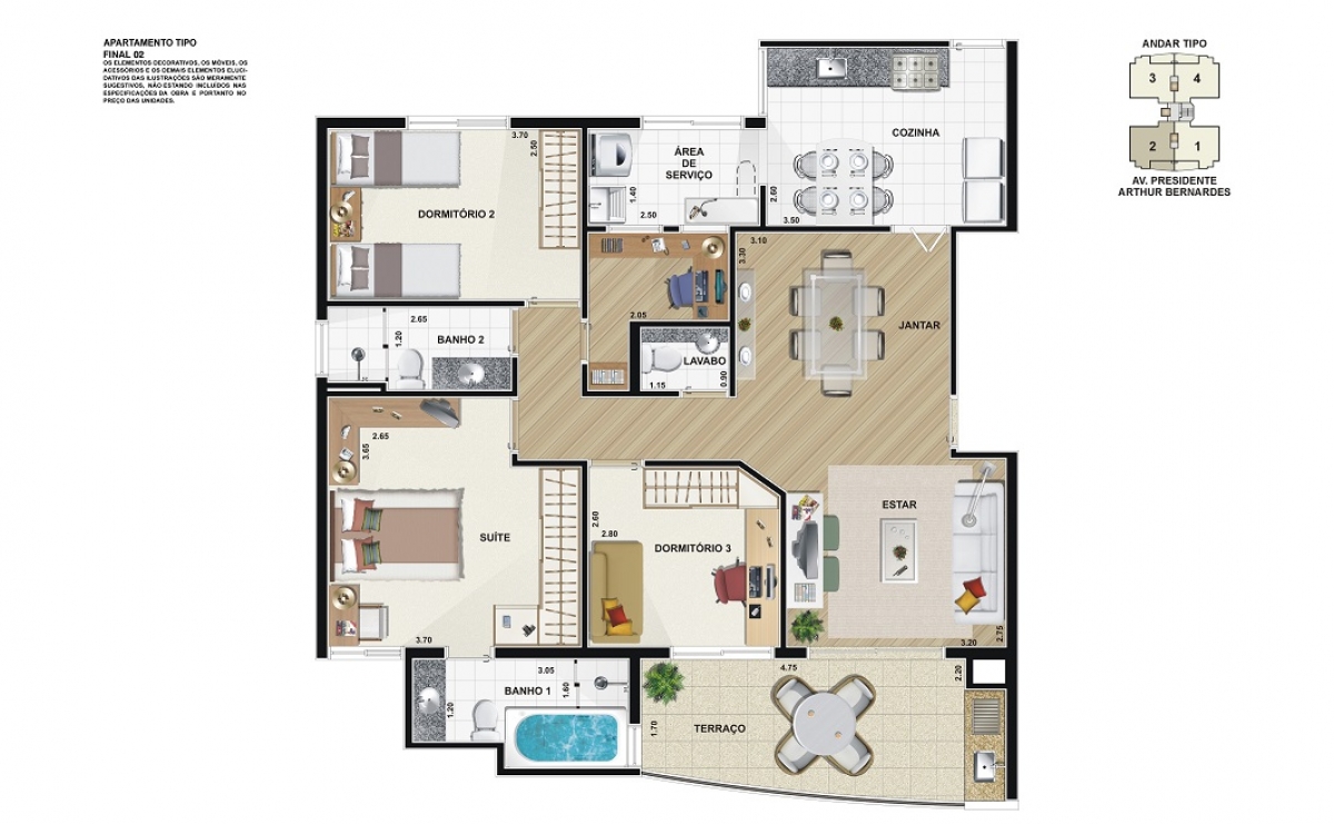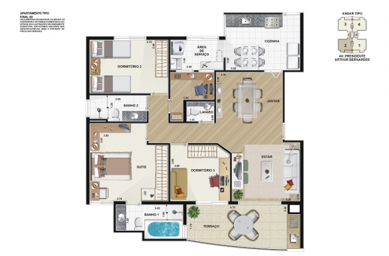 Apartamentos de 02 ou 03 dormitórios (01 suíte) com 100m², 02 ou 03 vagas de garagem, home office, ampla sacada com churrasqueira e pia, adega no subsolo (opcional)